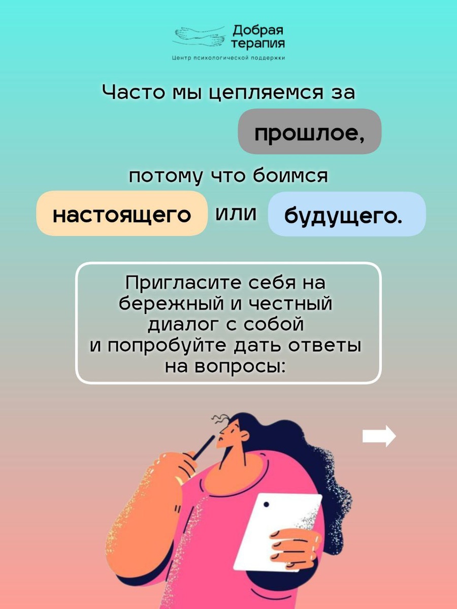 Нужно лишь качественно его завершить. Это значит дойти до точки, где воспоминания больше не вызывают острой боли или гнева и не требуют возвращаться к ним снова и снова. Где прошлое — это просто страница в вашей книге, а не открытая рана. 💛 Если вы чувствуете, что застряли и вам нужна поддержка, чтобы перевернуть эту страницу, психолог Доброй терапии Татьяна Макарова поможет вам пройти этот путь. В безопасном пространство вы сможете прожить горевание, дать волю словам и чувствам и проговорить вслух всё то, чему больше нет места в вашей настоящей жизни. 💫 Запишитесь на сессию, чтобы вернуться к себе — обновлённому и готовому к будущему.