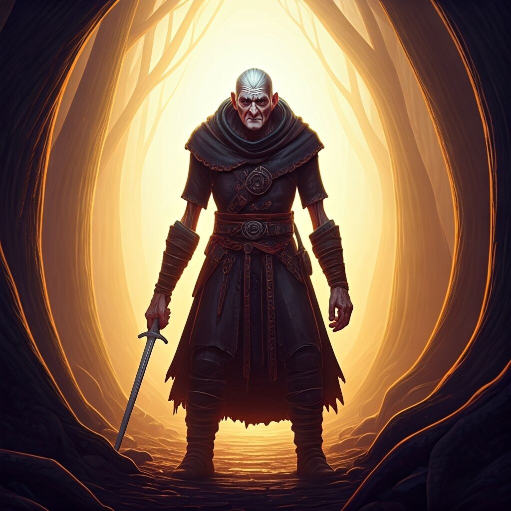 Это очень худой, костлявый старик с бледной кожей, седыми волосами и крючковатым носом. Он носит тёмную одежду и выглядит так, будто давно забыл, что такое обед.