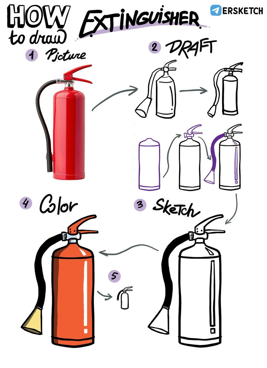 Огнетушитель состоит из корпуса, запорно-пускового устройства и распылителя. Есть разные виды огнетушителей, но узнаваемыми их делает сочетание этих частей. Начнём с корпуса. Это высокий цилиндр, красный, если вам есть чем его покрасить. Сверху — рычаг и рукоятка запорно-пускового устройства, которые надо сжать, чтобы начать тушить. От них выходит трубка. У углекислых огнетушителей на конце ещё раструб.