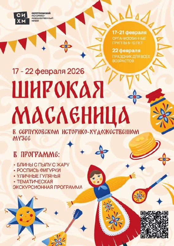 ✨ В Серпуховском музее – Масленица☀️ Не сидится дома в последние деньки зимние? Иди к нам за потехами да забавами молодецкими! ☀️ Будем блины есть – до икоты, орать – до хрипоты, петь – до надсады, плясать – до упаду! 🥞 🚫 Возраст: 0+ 📆 22.02.2026 🕒 12:00 🏢 Серпуховский историко-художественный музей 📍 Московская обл., г. Серпухов, ул. Чехова, д. 87 💰 Цена от: 600 до 1200 ₽ 🎫 Купить билет: https://clck.ru/3RQg7q ⭐Поддержать канал голосом 💰 Канал Вакансии Серпухова ✅ Мероприятия Серпухов https://dzen.ru/id/66f01c6eb4c6fe60c9ca1608 http://vk.com/serpukhov_events http://dzen.ru/serpukhov_events