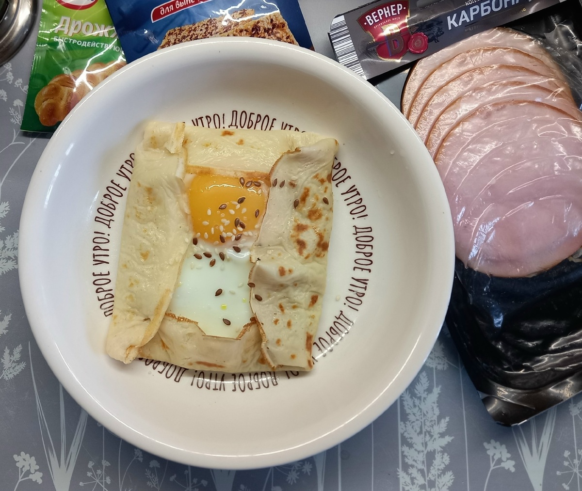 В Масленицу даже на завтрак блины! Все очень просто, если сделать блинную заготовку вечером, а утром с пылу-жару подать блинчики с сытной начинкой. Выбирайте тесто на блины по вкусу: на кефире, на молоке, на дрожжах. У меня на дрожжах: На блинчик кладем карбонад. На него - жареное яйцо. Заворачиваем края и посыпаем кунжутом. Если такой блинчик собирать на сковороде и дать ему немножко подпечься, то получите вкусную хрустящую корочку снизу. Завтрак на Масленицу готов без лишних усилий и кучи ингредиентов. Подаем горячим к ароматному кофе! Будье здоровы и вкусных вам посиделок!