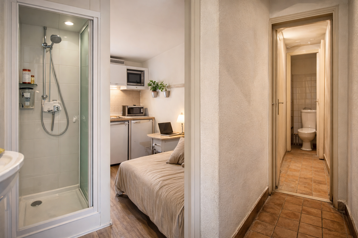 Французские мини-квартиры иногда имеют душ без туалета, потому что город сохранил огромный массив старых «служебных» комнат, потому что душ технически проще легализовать и врезать в сети, потому что туалет требует более тяжёлой канализации и согласований, и потому что закон для однокомнатного жилья долгое время допускал туалет вне квартиры, если он находится в здании.