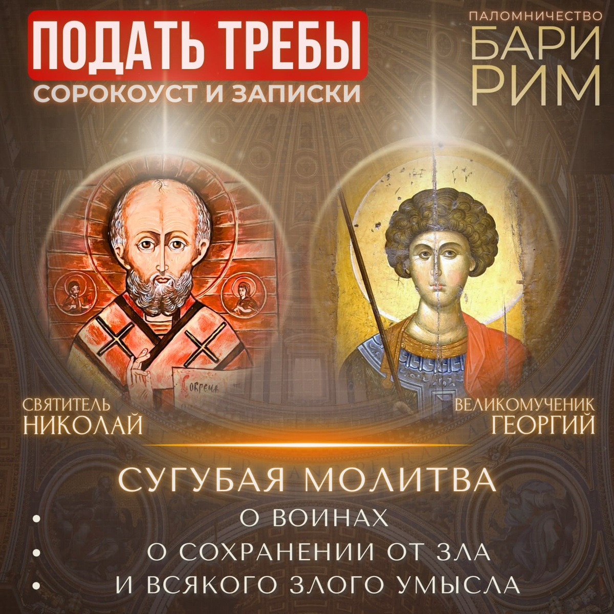 сугубая молитва о воинах ⬅️ назад Дорогие братья и сестры! К празднику Защитника Отечества мы совершаем паломническую поездку в Рим — к мощам святого великомученика Георгий Победоносец, и в город Бари — к мощам святителя Николай Чудотворец. 📌 Святой Георгий — воевода и мученик Христов, издревле почитаемый как покровитель воинов и защитник в брани. Большая часть его честных мощей, включая главу, с IV века пребывает в Риме. 📌 Святитель Николай — его имя означает «побеждающий», на протяжении веков он особо почитается как небесный покровитель воинов и моряков. 🙏 Сугубая молитва паломничества: — о воинах — о сохранении от зла и всякого злого умысла 🔴 ПРЯМЫЕ ТРАНСЛЯЦИИ — YouTube и VK: — 22 февраля, 18:00 (МСК) — Базилика Николая Чудотворца, Бари — 23 февраля, 13:00 (МСК) — Храм Георгия Победоносца в Велабро, Рим ____ ✍️ Подать записки можно на сайте: 👉 spyridon-rimini.ru/treba 📌 Все имена, поданные на сорокоуст, будут помянуты во все дни паломничества 📌 Записки "В святом месте