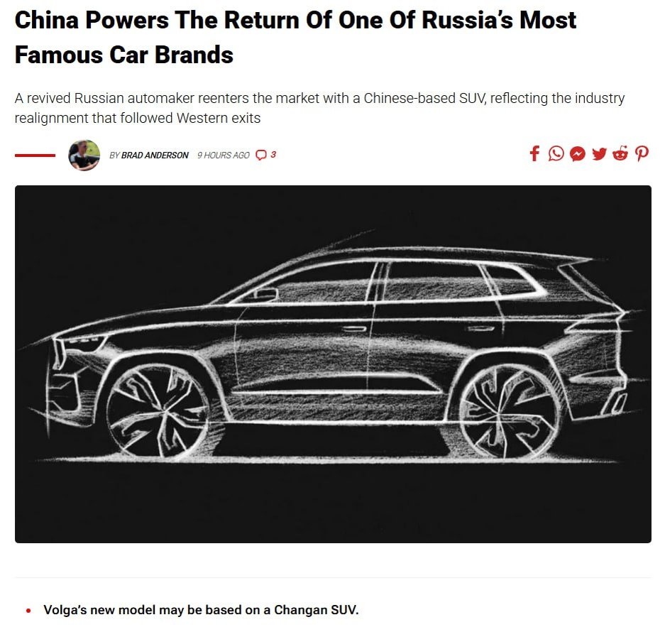 автомобильные сайты. Недавно мы, например, цитировали статью коллег о "Руссо-Балте", загадочном фургоне из нержавейки. По сути, Carscoops упрекнул Tesla в том, что у русских, дескать, уже есть Cybervan, который мог бы составить пару американскому Cybertruck. Но иногда у Carscoops бывают и явные неудачи. Вот как вчера, когда автор этого сайта с говорящим именем Брэд Андерсон решил написать про возрождаемый бренд Volga. То ли его "забанили в Гугле", то ли он и не дал себе труда провести элементарный фактчекинг, но в итоге читатели узнают, в том числе, следующие подробности: "Компания Volga, ныне входящая в состав китайской Changan, представила в мае 2024 года три различных автомобиля, известных как K30, X5 Plus и K40. В тройку вошли два кроссовера и седан, каждый из которых был создан на базе существующих автомобилей Changan, продаваемых в Китае. Планировалось производить их в Китае и поставлять в Россию для окончательной сборки, а выход на рынок был запланирован на конец 2024 года.