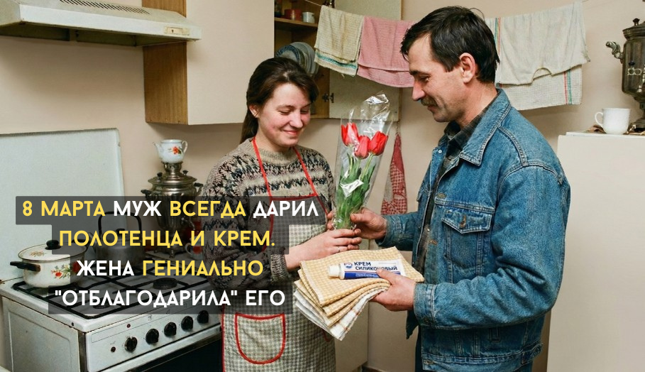 Прошли годы. Дефицит давно канул в Лету, полки магазинов ломятся от изобилия, с деньгами в семье тоже давно полный порядок. Но у мужа наступила тотальная подарочная стагнация. Он просто перестал напрягаться и продолжал из года в год, на автопилоте, нести в дом унылые полотенчики, миксеры и кремы для рук.