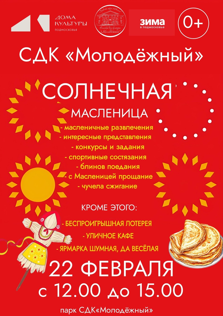 ✨ Широкая Масленица в посёлке Молодежный с 12.00 до 15.00 ✔️ масленичные развлечения ✔️ интересные представления ✔️ конкурсы и задания ✔️ спортивные состязания ✔️ прощание с Масленицей 🤩 А ещё: ⭕ Лотерея, призы, подарки, море улыбок и отличное настроение! ⭕ Кульминационный момент – сжигание чучела Масленицы, символичное прощание с зимой и готовность ко встрече весны! 🐎 В конце вас ждёт финальный розыгрыш беспроигрышной лотереи. 🚫 Возраст: 0+ 📆 22.02.2026 🕒 12:00 🏢 СДК «Молодежный» 📍 г.о. Подольск, пос. Молодёжный, д.30 💰 Вход свободный❗️ ⭐Поддержать канал голосом 🍰Где поесть в Подольске ✅ Мероприятия Подольск https://dzen.ru/id/66ed500f7b5671493eca3fd6 http://vk.com/podolsk_events http://dzen.ru/podolsk_events