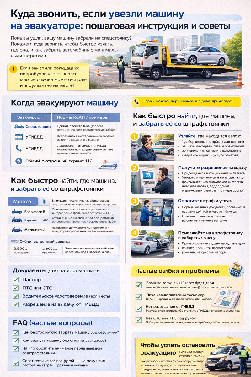 В этом материале — понятный алгоритм: что делать сразу, куда звонить, какие документы нужны, как забрать машину со штрафстоянки, что делать при повреждениях и как действовать, если эвакуация кажется незаконной.