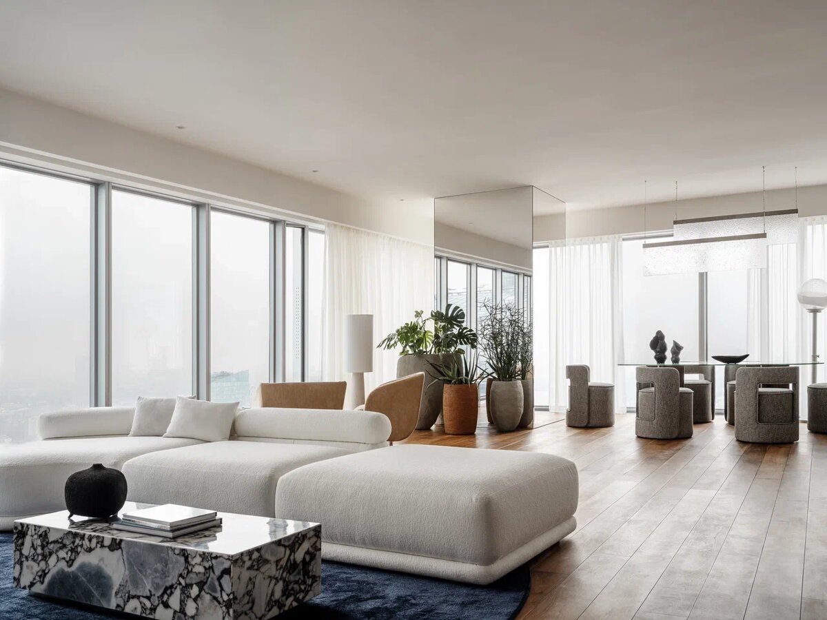 Иногда в интерьере есть элемент, который невозможно убрать – но можно переосмыслить. В этих апартаментах площадью 170 м² в Москва-Сити такой задачей стала колонна от застройщика в гостиной, расположенная прямо напротив входа. Исходные данные Заказчики – молодая пара из сферы IT, много путешествующая и живущая в ритме большого города. Им важно было сохранить динамику и масштаб пространства, но при этом создать тихую, уютную среду для отдыха и работы. Проблема Колонна в углу гостиной визуально «резала» пространство. В открытой планировке она могла стать тяжёлым акцентом и нарушить ощущение целостности. Снос невозможен. Игнорировать – значит оставить интерьер незавершённым. Решение Согласно идее дизайнера, мы облицевали колонну зеркалами.