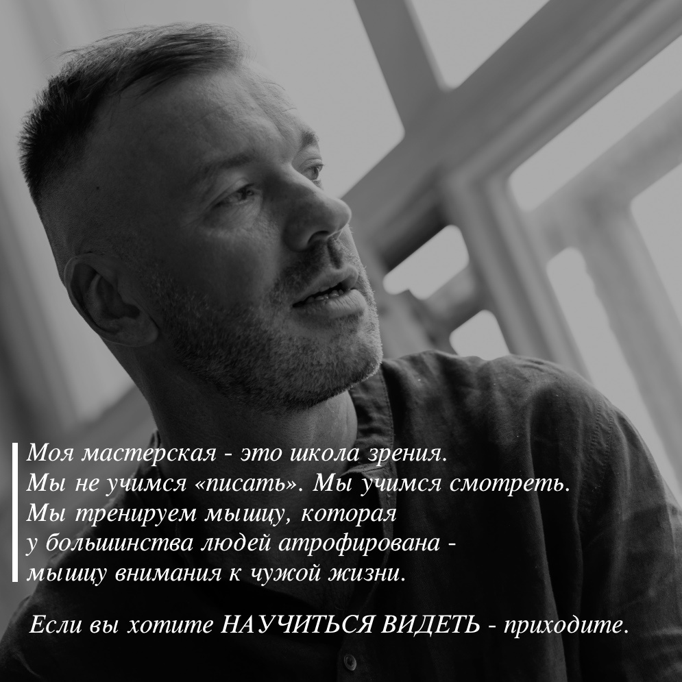 Моя мастерская - это школа зрения. Мы не учимся «писать». Мы учимся смотреть. Мы тренируем мышцу, которая у большинства людей атрофирована - мышцу внимания к чужой жизни.