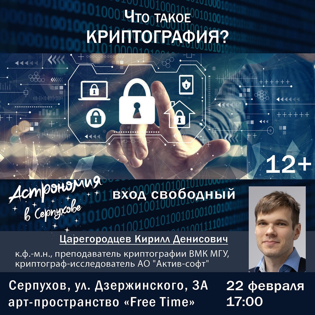 ✨ Заглянем в мир современной криптографии 🔐В самом деле, с давних времён люди скрывали секреты от посторонних глаз, преобразуя сообщения с помощью шифров. Теперь криптография обеспечивает не только конфиденциальность (зашифрование сообщений). Узнаем подробнее о ее роли в современном мире. 📚Лекцию проводит преподаватель криптографии МГУ, Царегородцев Кирилл Денисович. 🌔- 1.5 часа 🌕Сменная обувь обязательна (можно в своей, можно в тапочках арт-пространства) 🚫 Возраст: 12+ 📆 22.02.2026 🕒 17:00 🏢 Арт-пространство Free time 📍 г. Серпухов, ул. Дзержинского, д. 3А 💰 Вход свободный❗️ ⭐Поддержать канал голосом 💰 Канал Вакансии Серпухова ✅ Мероприятия Серпухов https://dzen.ru/id/66f01c6eb4c6fe60c9ca1608 http://vk.com/serpukhov_events http://dzen.ru/serpukhov_events