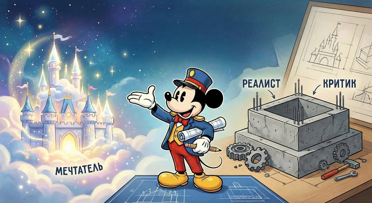 Случалось ли у вас такое: вечером в голову приходит гениальная идея, от которой захватывает дух, а утром вы просыпаетесь, и внутренний голос бубнит: «Денег нет, времени нет, кому это нужно?». Идея умирает, даже не родившись. Мы часто думаем, что проблема в отсутствии таланта или ресурсов. Но на самом деле проблема в хаосе у нас в голове. Мы пытаемся одновременно жать на газ и на тормоз. Уолт Дисней — человек, построивший империю грез, — умел мечтать как ребенок и строить бизнес как банкир. Позже этот инструмент смоделировал Роберт Дилтс, назвав его «Стратегия творчества Уолта Диснея». Суть метода — в разделении ролей. Внутри каждого из нас живут три персонажа: Мечтатель, Реалист и Критик. Дисней рассаживает их по разным комнатам, чтобы они не перебивали друг друга. 1. Мечтатель «А что, если?..» Это ваша внутренняя искра. Для Мечтателя нет слова «невозможно», нет бюджетов и ограничений. Задача: Генерировать идеи и видеть конечную картинку. Каким будет результат в идеальном мире? Запреще