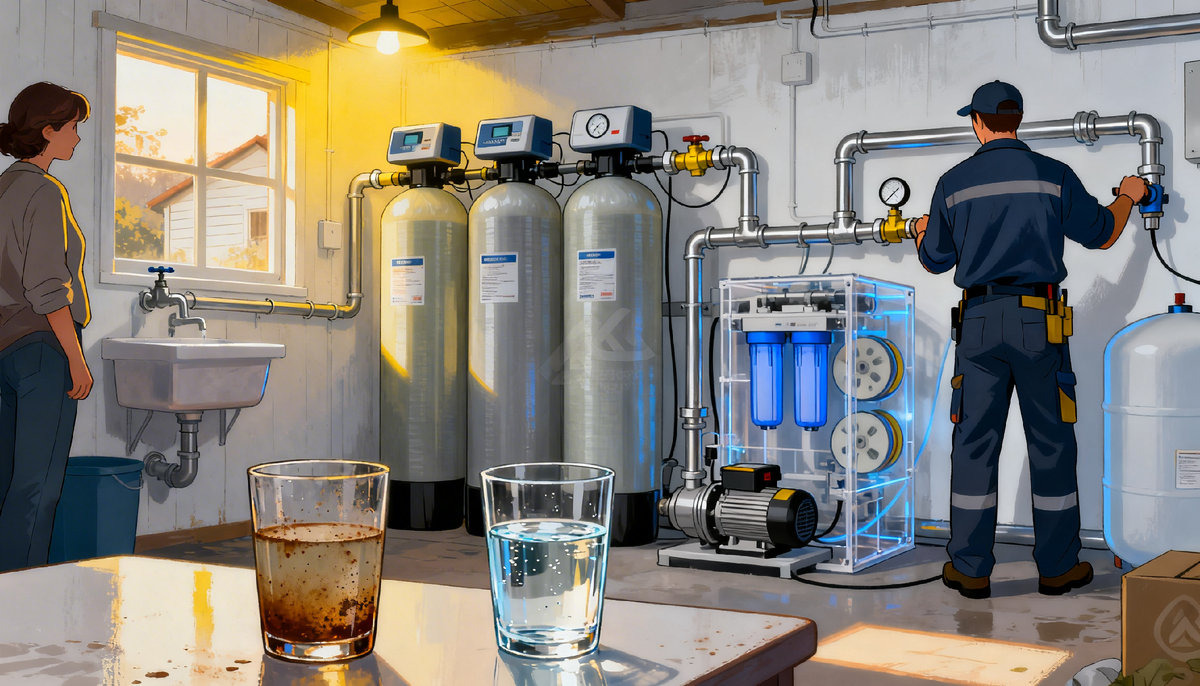 Вода из скважины или колодца редко бывает идеальной сразу. Чаще всего владельцы загородных домов сталкиваются с «коктейлем» проблем: вода вроде прозрачная, но пахнет железом, оставляет рыжие подтеки на сантехнике, а бойлер забивается накипью быстрее, чем заканчивается гарантия. В такой ситуации одиночный фильтр не спасет — он просто не справится с нагрузкой. Здесь нужна комплексная система очистки воды: инженерное решение, которое убирает и химические примеси, и запахи, и мутность в несколько этапов. Разберем, как понять, что вам нужен именно комплекс, из чего он состоит и как не переплатить при подборе.