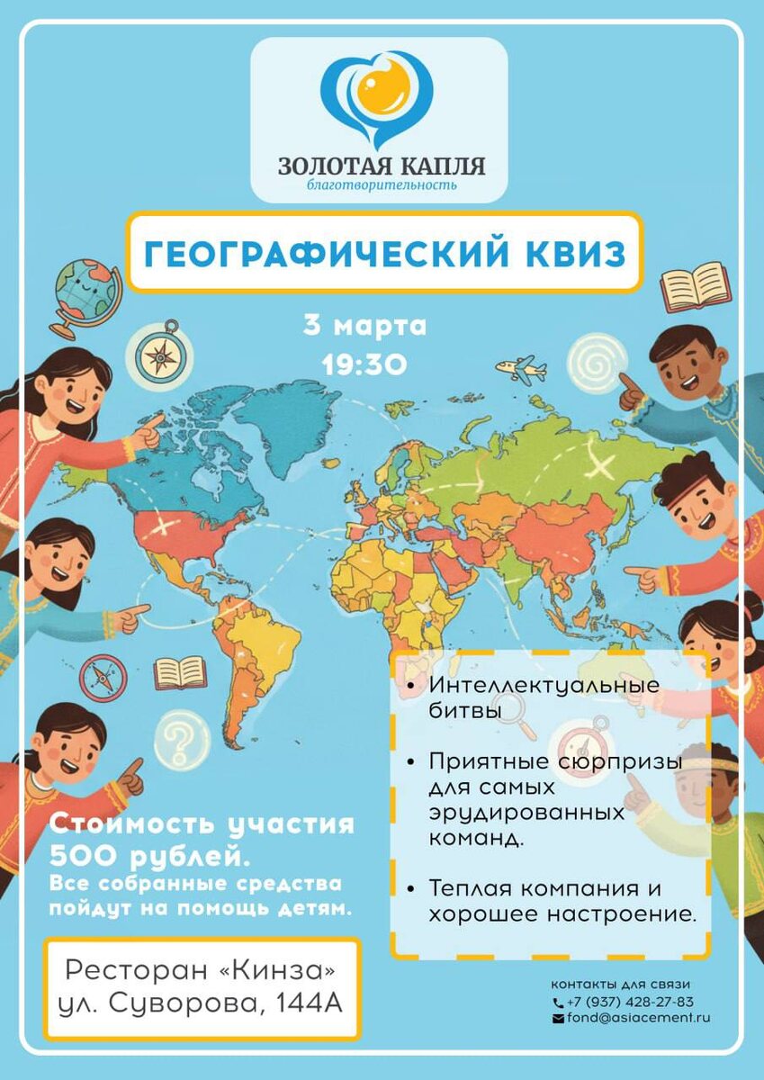 ! 3 марта в 19:30 в ресторане «Кинза» ул. Суворова, 144А состоится благотворительный географический квиз! Вопросы для квиза подготовила учитель географии 🔥 Что вас ждёт? - Увлекательные вопросы про страны, столицы, природные чудеса и неочевидные факты. - Теплая компания и хорошее настроение. - Приятные сюрпризы для самых эрудированных команд. ❤️ А главное - каждый билет станет вкладом в лечение и реабилитацию подопечных фонда «Золотая капля». Стоимость участия: 500 рублей. Записывайте свою команду по ссылке Ждём всех!