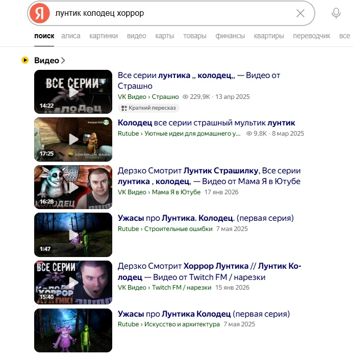 Короче, решила я погуглить «Страшные факты про Лунтика» надо было для статьи. смотрю и вижу «Колодец Лунтика все серии» решила загуглить: Там на первом же видео картинка. По сюжету (я не смотрела но) Лунтик падает в колодец и кого-то тащит с собой. как я думаю то там 5 серий. Вот пару фото: Эээ.. что с Лунтиком? он какой-то желтый и глаза черные. Понятно по лицу того мужика что 3 серия криповая. Это кажись ещё 1 серия. Что с Бабой-Капой? У неё лицо такое странное. А Лунтик пельменей кажись нажрался. а эти руки с лева кажется того червяка (не помню имя червяка). И-и-и.. Финальное фото(оно не про Лунтика): ... Больше нечего сказать, посмотрим серии с Лизой - скажем. А пока что можете сами увидеть