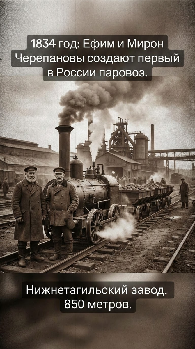 • 1834 год: Ефим и Мирон Черепановы (отец и сын) на Нижнетагильском заводе создают первый в России паровоз. Он возил руду на расстояние 850 метров. • 1837 год: Открытие Царскосельской железной дороги (Петербург — Царское Село). По ней пошел первый общественный поезд «Проворный» (закуплен в Англии). • 1851 год: Открытие Николаевской железной дороги (Санкт-Петербург — Москва). Появились первые в России магистральные пассажирские и товарные паровозы (серии «В» и «Н»). Поездка занимала около 18–19 часов. • 1870-е — 1890-е гг.: Массовое строительство железных дорог. Появляются легендарные паровозы серии «О» («Овечка») — самые массовые в дореволюционной России. • 1891 год: Начало строительства Транссибирской магистрали. Для неё создаются мощные товарные паровозы и комфортабельные вагоны с отоплением и освещением. • 1913 год: На пике Российской империи создаются скоростные паровозы серии «С», развивавшие скорость до 115 км/ч. • 1924 год: В Ленинграде построен первый в мире магистральн