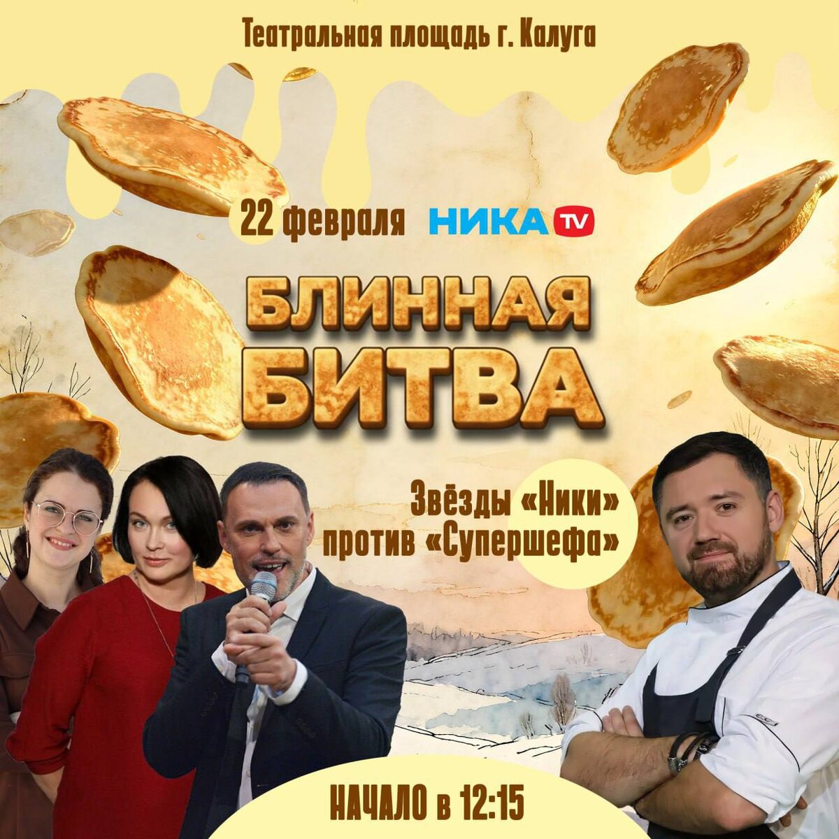 ! 22 февраля, в честь 35-летия телерадиокомпании «Ника» - угощаем блинами! Приглашаем вас на Театральную площадь Калуги на грандиозное шоу — «Блинную битву»! 🔥 В красном углу: звёзды эфиров — Татьяна Зимушина, Марина Глушенкова и Павел Селезнёв. 🔥 В синем углу: профессиональный супершеф — Юрий Семыкин. В роли судей - ВЫ! Кто приготовит вкуснее? Кто проявит больше креатива с начинками? Решать вам! 📺 Важно: Мы будем вести прямой эфир в ТВ и в наших соцсетях (старт в 12:15). НО! Никакая картинка не заменит живого праздника, аромата свежих блинов и свежей атмосферы! ✅ Поэтому ждём именно ВАС на Театральной площади! Приходите пробовать, болеть за любимых ведущих и вместе с нами отпраздновать юбилей «Ники». 🗓 Когда: 22 февраля ⏰ Начало эфира и действия: 12:15 📍 Где: Театральная площадь, Калуга Встречаем весну вкусно вместе с «Никой»! ❤️ 📺 Подписывайтесь на наш канал в Максе