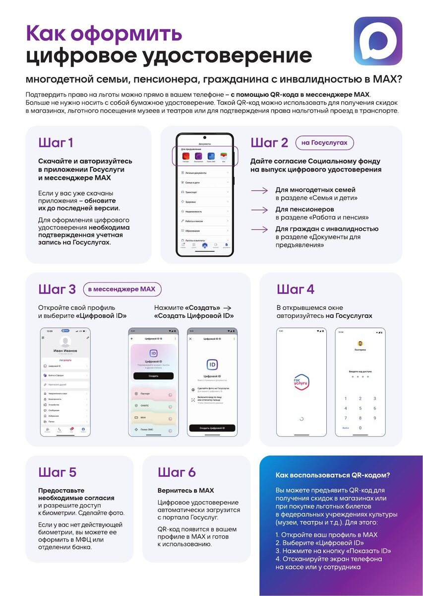 ? Подтвердить право на льготы можно прямо в вашем телефоне – с помощью QR-кода в мессенджере MAX. Больше не нужно носить с собой бумажное удостоверение. Такой QR-код можно использовать для получения скидок в магазинах, льготного посещения музеев и театров или для подтверждения права на льготный проезд в транспорте. Шаг 1 Скачайте и авторизуйтесь в приложении Госуслуги и мессенджере MAX Если у вас уже скачаны приложения – обновите их до последней версии. Для оформления цифрового удостоверения необходима подтвержденная учетная запись на Госуслугах. Шаг 2 (на Госуслугах) Дайте согласие Социальному фонду на выпуск цифрового удостоверения → Для многодетных семей в разделе «Семья и дети» → Для пенсионеров в разделе «Работа и пенсия» → Для граждан с инвалидностью в разделе «Документы для предъявления» Шаг 3 (в мессенджере MAX) Откройте свой профиль и выберите «Цифровой ID» Нажмите «Создать» → «Создать Цифровой ID» Шаг 4 В открывшемся окне авторизуйтесь на Госуслугах Шаг 5 Предоставь