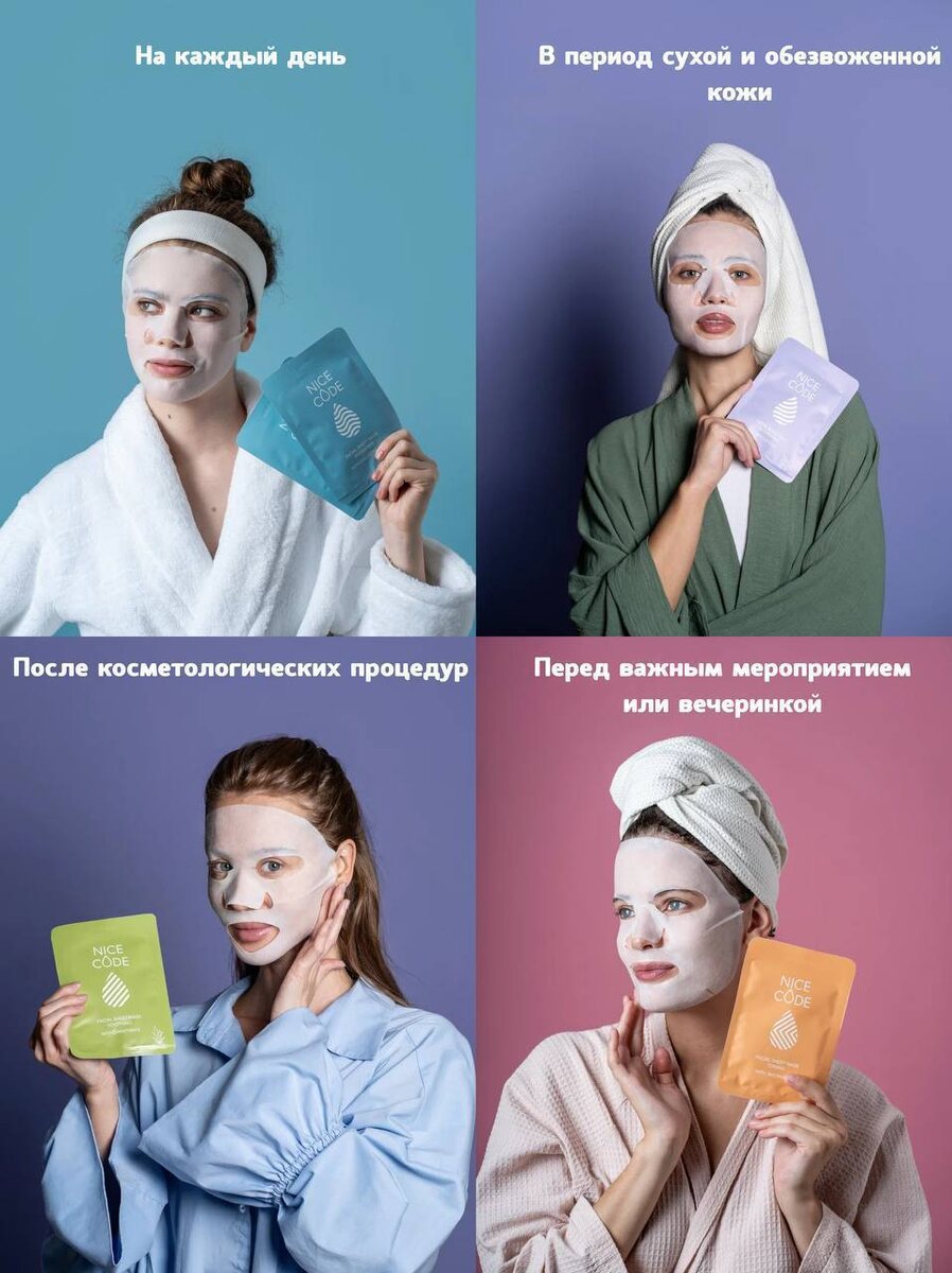 : 💚 Успокаивающая — обогащенная Д-пантенолом и натуральным соком алоэ вера, маска позволит насладиться мгновениями заботы о коже, оставив позади все признаки дискомфорта. 💜 Питательная — благодаря пептиду в составе эссенция проникает в глубокие слои дермы, способствуя активной регенерации клеток и восстановлению их натурального баланса. 🧡 Тонизирующая — обогащенная уникальным комплексом из 17 аминокислот и витамина А, маска глубоко проникает в слои кожи, восстанавливая ее структуру. 🩵 Увлажняющая — благодаря уникальному активному комплексу, обогащенному ниацинамидом и аминокислотами, она не только быстро увлажняет, но и способствует повышению упругости и плотности кожи. ⭐️В эти выходные со скидкой: увлажняющая и питательная.