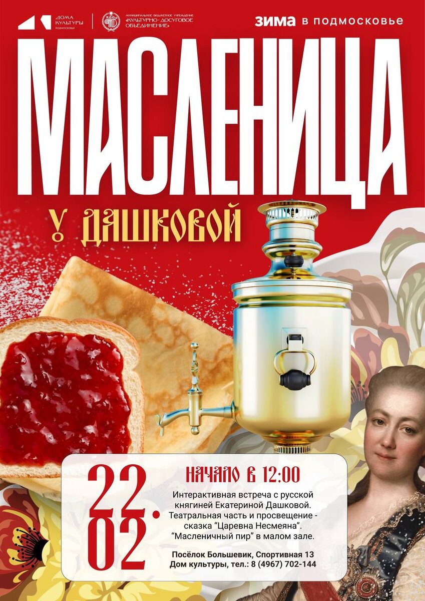 ✨ Масленица в посёлке Большевик Масленица уже на пороге! Горячие блины, ароматный чай, музыка, смех и отличное настроение 🥞✨ Приходите всей семьёй весну встречать! 22 февраля в 12:00 всех гостей праздника ждет: - Личная аудиенция у княгини Дашковой, - Спектакль «Царевна Несмеяна» - и угощения в лучших традициях русского гостеприимства! 🚫 Возраст: 0+ 📆 22.02.2026 🕒 12:00 🏢 ДК "Большевик" 📍 г.о. Серпухов, пос. Большевик, ул. Спортивная, д.13 💰 Вход свободный❗️ ⭐Поддержать канал голосом 💰 Канал Вакансии Серпухова ✅ Мероприятия Серпухов https://dzen.ru/id/66f01c6eb4c6fe60c9ca1608 http://vk.com/serpukhov_events http://dzen.ru/serpukhov_events