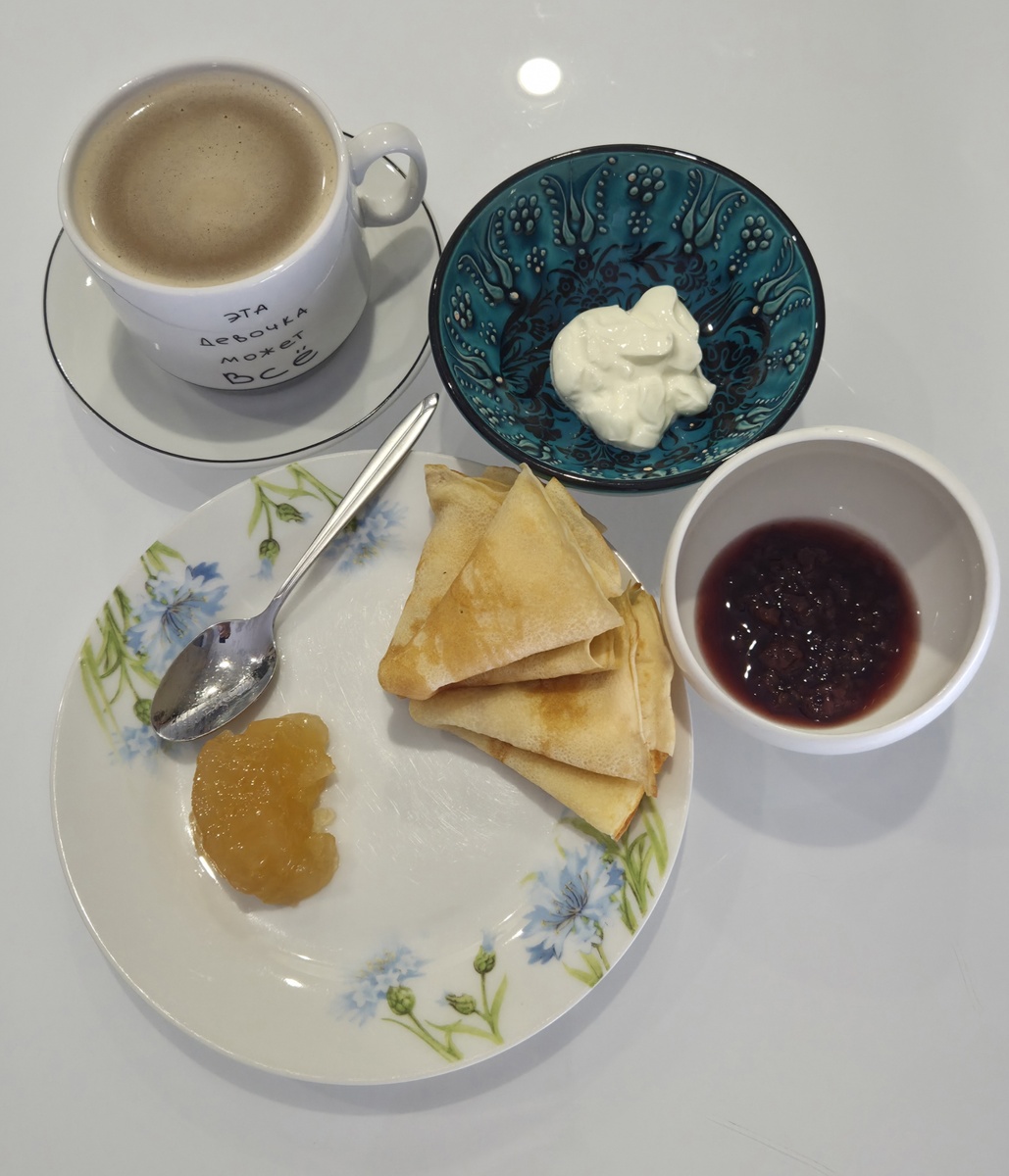 Со вчерашнего эксперимента остались ещё блины, так что на завтрак можно ничего не придумывать. Последний день масленичной недели-Прощенное воскресенье-и блины на завтрак прямо в тему. Добавлю к ним сметаны, грушевый конфитюр и мамино малиновое варенье. Ну и кофе сварю, конечно ж. Весенняя тарелочка) Через неделю уже весна! Доброе утро 🌄 И пусть у вас всё получится! Мой телеграм-канал с завтраками
