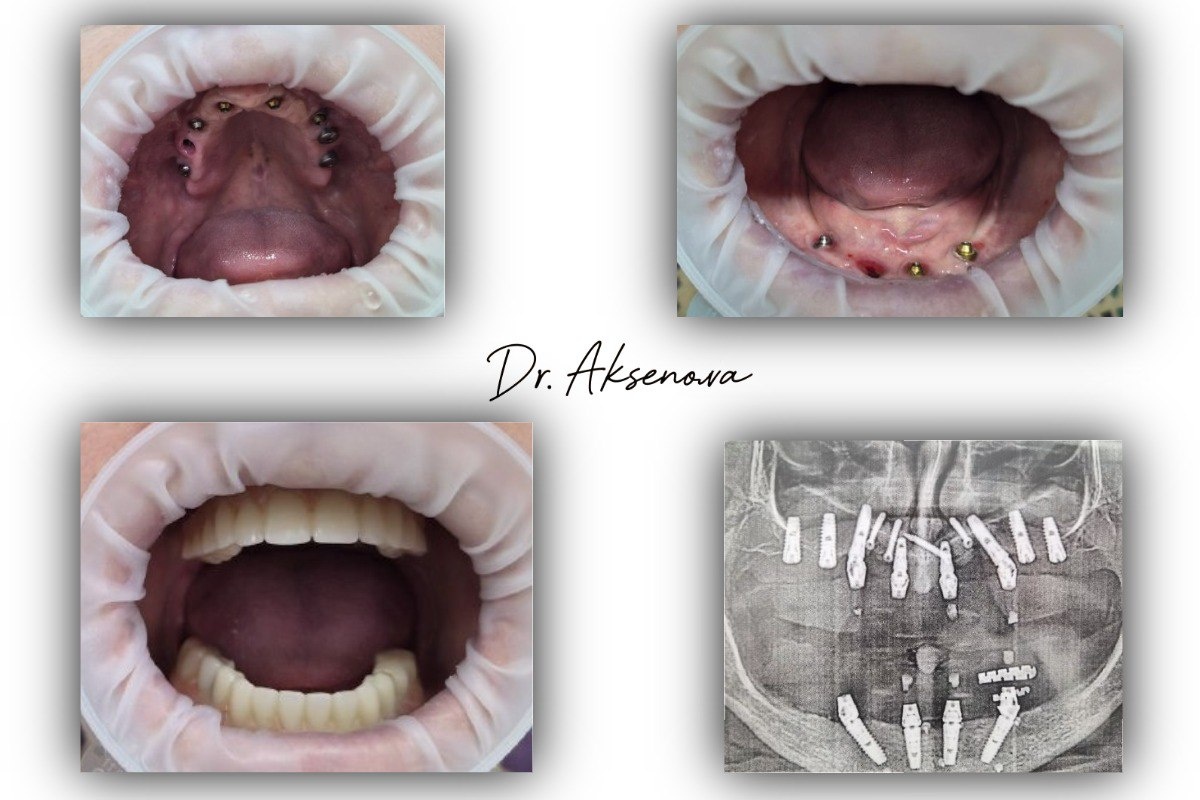 Пациентка пришла 6 месяцев назад с ситуацией, которая заставила задуматься: 4 импланта сверху, 4 снизу