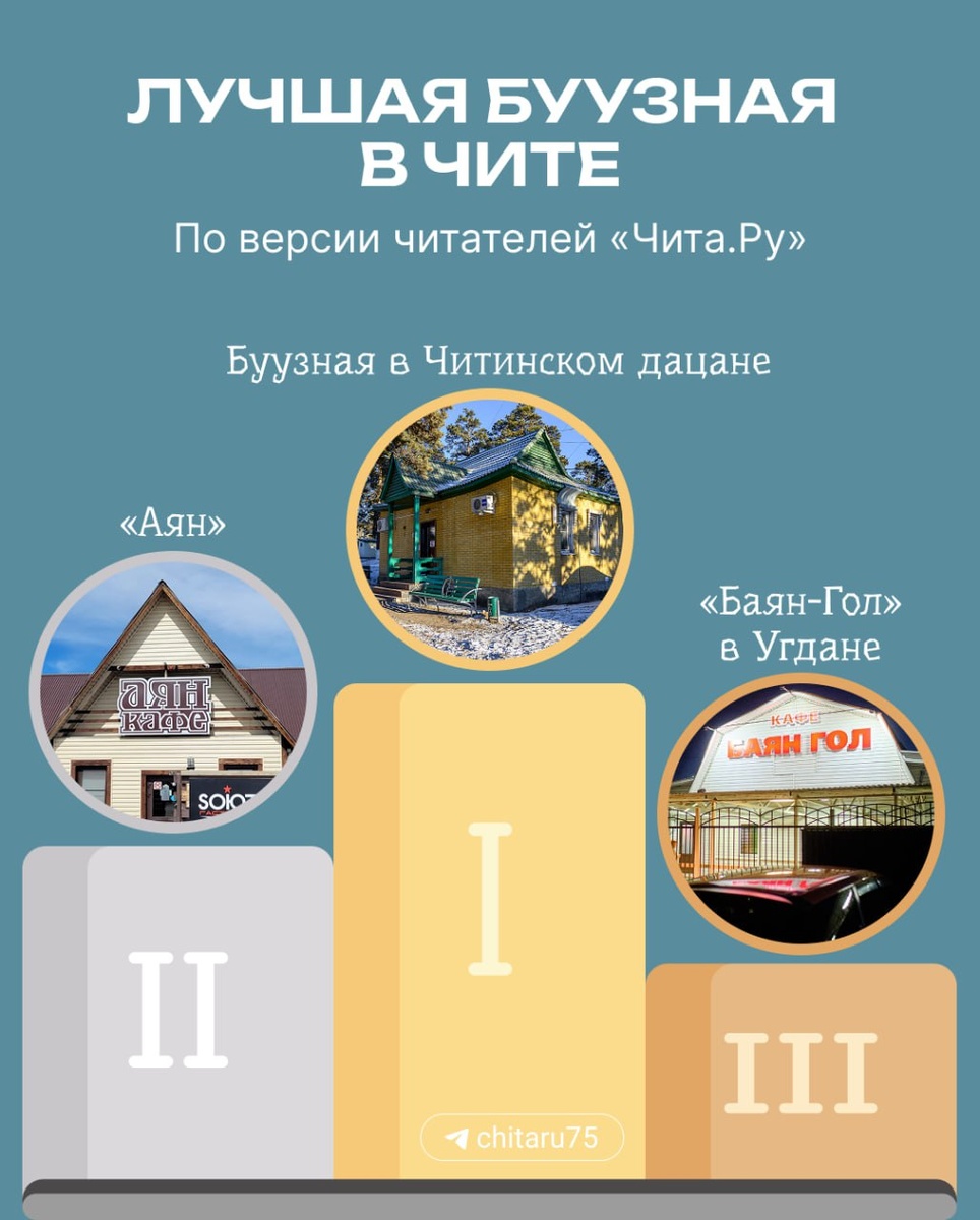 Где готовят самые вкусные буузы в Чите? Мы провели опрос, в котором читатели выбрали самое лучшее заведение. Первое место заняла буузная в Читинском дацане, набрав 1274 голоса. Второе место с небольшим отрывом у сети «Аян» — 1129 голосов. «Баян-Гол» в Угдане занял третье место — его выбрали 504 человека. На четвёртом месте — буузная в ТЦ «Азия» в 1-м микрорайоне, на пятом и шестом — «Белая Юрта» на площади Революции и «Бууза Рум» на Олимпийской, на седьмом — «Тесто и Мясо» на Шилова и на восьмом — «Лотос» на Крымской. Читатели отметили, что буузная в 1-микрорайоне раньше была в Сосновом бору и много лет держит марку. Некоторые только сейчас узнали о переезде и запланировали там обед. Также читатели писали про кафе «Кедр» на федералке Чита — Забайкальск. Люди отмечают, что сока в здешних буузах, как тарелка бульона, а тесто тоненькое. 📌📌📌📌📌 «Чита.Ру» в MAX
