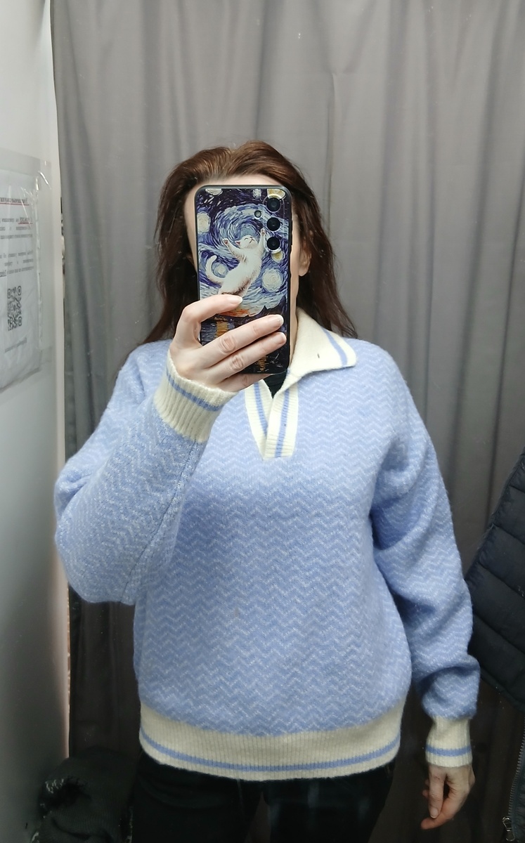 Здравствуйте, наконец я в строю). Сначала хвороба подкосила мужа, потом через пару дней меня, затем сына. Если нам с мужем не удалось нагреть выше 37,6, то сын дал жару сразу до 39. Но самое главное я не перестала чудить. На днях налила в чайник воды, включила пипку и пошла цветы поливать. Вернулась, а чайник холодный! Я и пипку подергала и свет в квартире проверила и за вилку подержалась, не работает!! Оказалось, что чайник стоял прямо на столешнице, а не на законной подставке!!! Так что я пропустила все хорошие скидки и пошла уже на то что есть, на "Купи две вещи и 3-ю получи в подарок". Джемпер с воротником как у поло, только без пуговиц. Очень приятный трикотаж, не тонкий и мягкий. Без состава. Немного хиппи)). Не могла не померить, хотя это вообще не мой вариант. Зелёные полоски ещё и бисером с пайетками расшиты. Тактильно мне не очень понравился трикотаж, шершавый такой, так сказать не льнет)), но больше половины вискозы. Зимняя куртка, очень зимняя, без капюшона, но зато ка