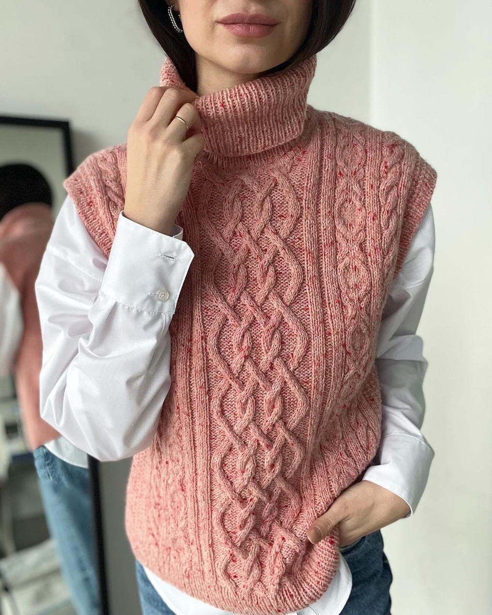 № 1: Пастельно-розовый твидовый жилет с высоким воротом и аранами ♥