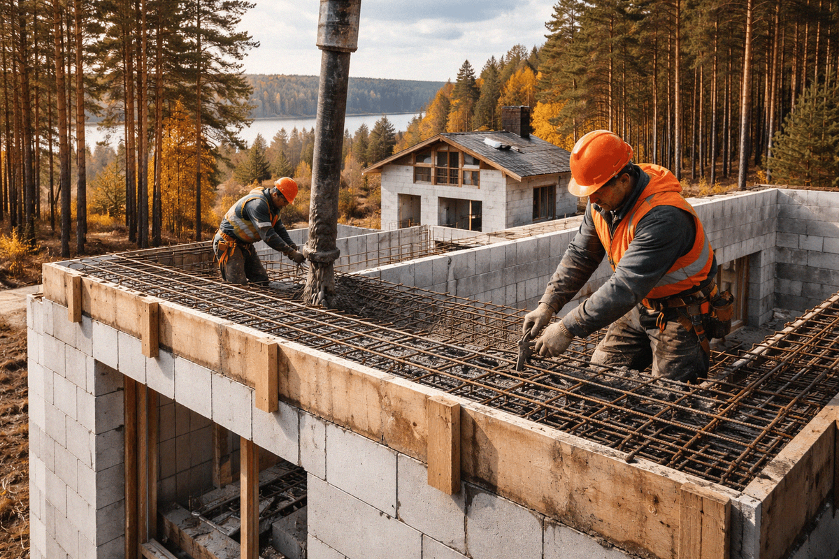 - Заливка за один день. Армопояс для крыши должен быть монолитным кольцом. Правило одного дня гласит: никаких заливок частями. Холодные швы разрывают контур и обнуляют всю несущую способность конструкции. Бетон марки М200-М300 в Екатеринбурге сейчас стоит порядка 5000-5500 рублей за куб. Дешевле заказать заводскую смесь и бетононасос (аренда от 15 000 руб.), чем мешать раствор вручную, рискуя качеством.