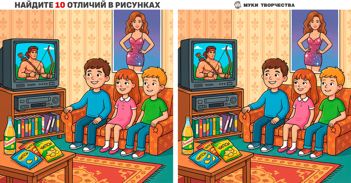 Сегодня задачка на внимание с ностальгией по 90-м. Перед вами две очень похожие картинки с ребятами, смотрящими популярный фильм Рэмбо по видеомагнитофону. Наверняка многим знакомы эти эмоции. Первые видеосалоны и кассеты VHS, которые передавались из рук в руки. Но есть нюанс. Хитрый художник сделал в одной картинке 10-ть отличий. Проверьте свою наблюдательность и найдите все отличия. В конце статьи будет ПОДСКАЗКА-ОТВЕТ. Воспользуйтесь ею для проверки своих предположений и на случай, если поиски совсем заведут в тупик. Надеюсь, вам понравится сегодняшняя тематическая задачка для ума. Поделитесь ею с человеком, который поймёт. Горизонтальный вариант задачки: Домашний видеосалон из 90-х Вертикальный вариант задачки: Домашний видеосалон из 90-х НИЖЕ ОТВЕТ-ПОДСКАЗКА: