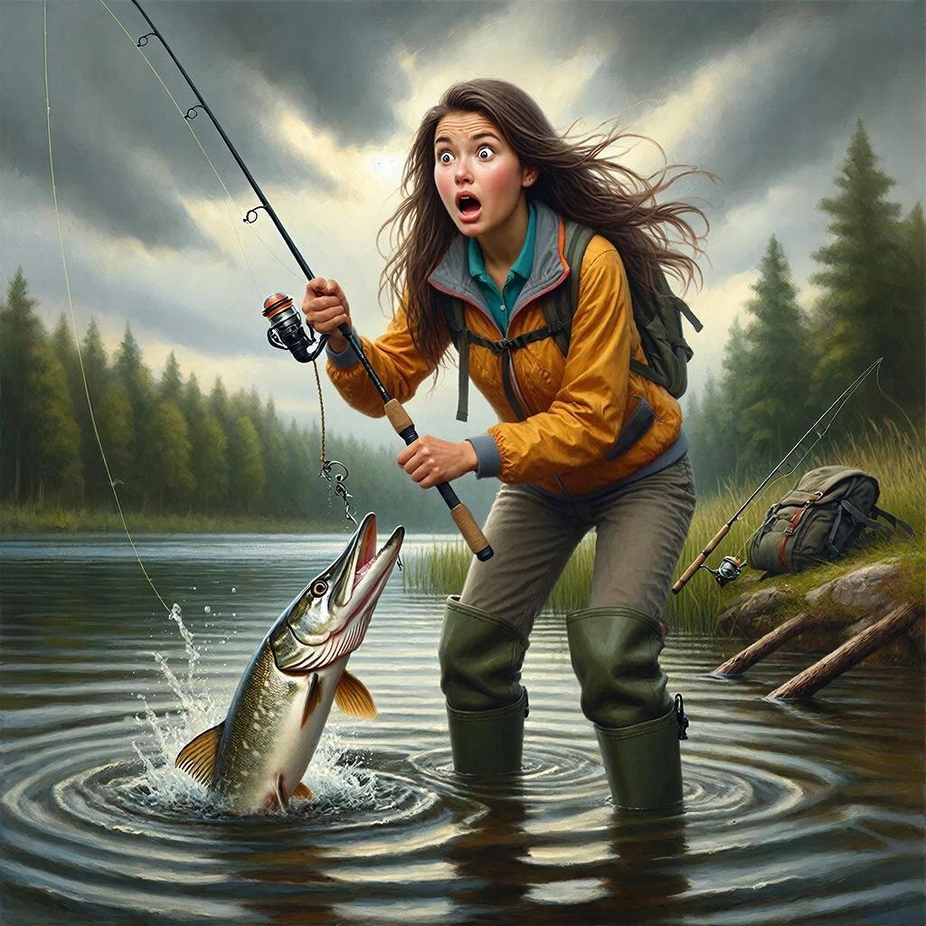 Клюнуло! И не просто клюнуло, а будто под водой торпеда взорвалась. Катушка трещит, леска натянулась как струна. Начинаю вываживать. Тяну, а меня саму к воде тянет. Упираюсь ногами в скользкий берег, а ноги-то в новых резиновых сапогах, которые, как назло, на два размера больше. Чувствую, начинаю сползать к воде, как по маслу. Сапог левой ноги уже в озеро залез, вода холодная — аж дух захватило. Думаю: «Все, пропала. Сейчас буду как та щука, только в обратную сторону — из воды на берег, а меня обратно затянут».