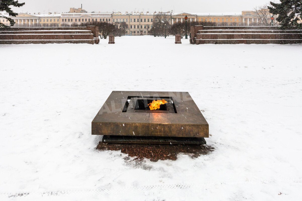 Вид на мемориал Вечного огня на Марсовом поле во время снегопада в Санкт-Петербурге. shutterstock.com