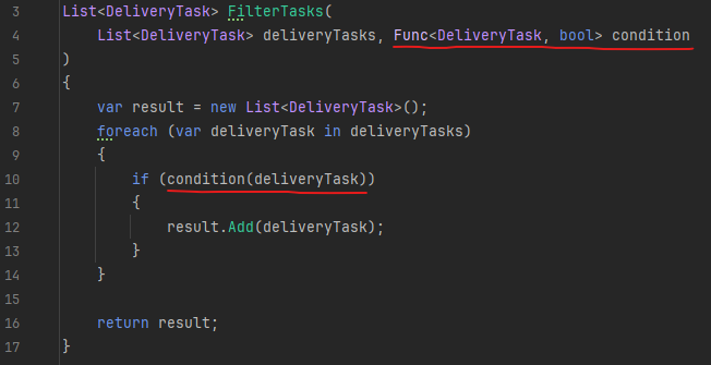 - Типы входных аргументов тоже не указываются - C# обычно может понять их по контексту. Например, у нас лямбда написана как второй аргумент функции FilterTasks(). Она принимает на вход функцию, которая в свою очередь принимает на вход объект класса DeliveryTask. Так что можно сделать логический вывод, что x - это объект класса DeliveryTask. Но, если надо, то можно и указать типы.