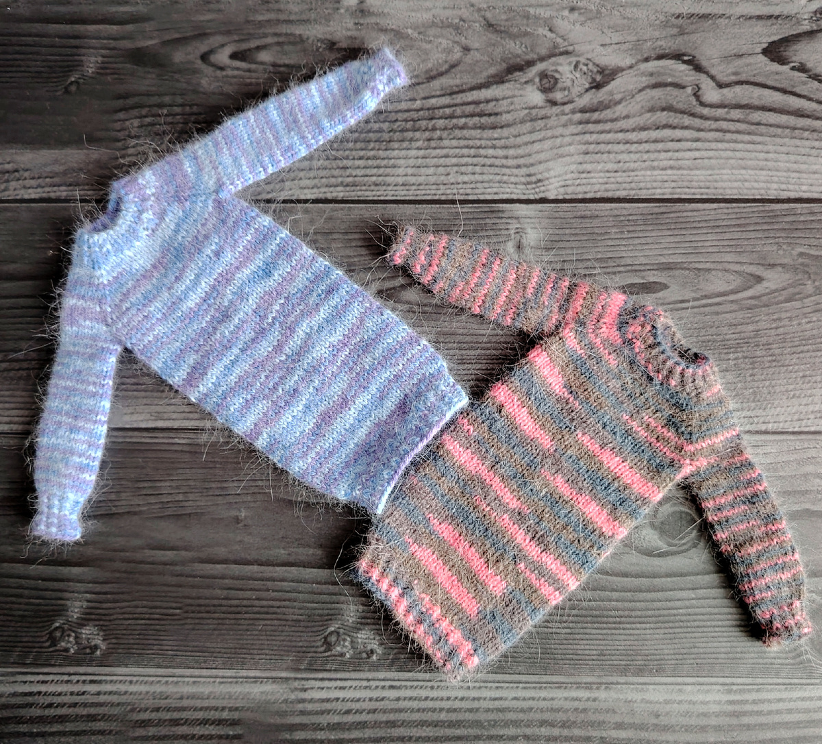 Когда я показала вам Оникс в белом вязаном платье, там же поделилась планами связать несколько подобных в других расцветках. Эти два связаны из пуха норки секционного окрашивания, приобретенного на ВБ.