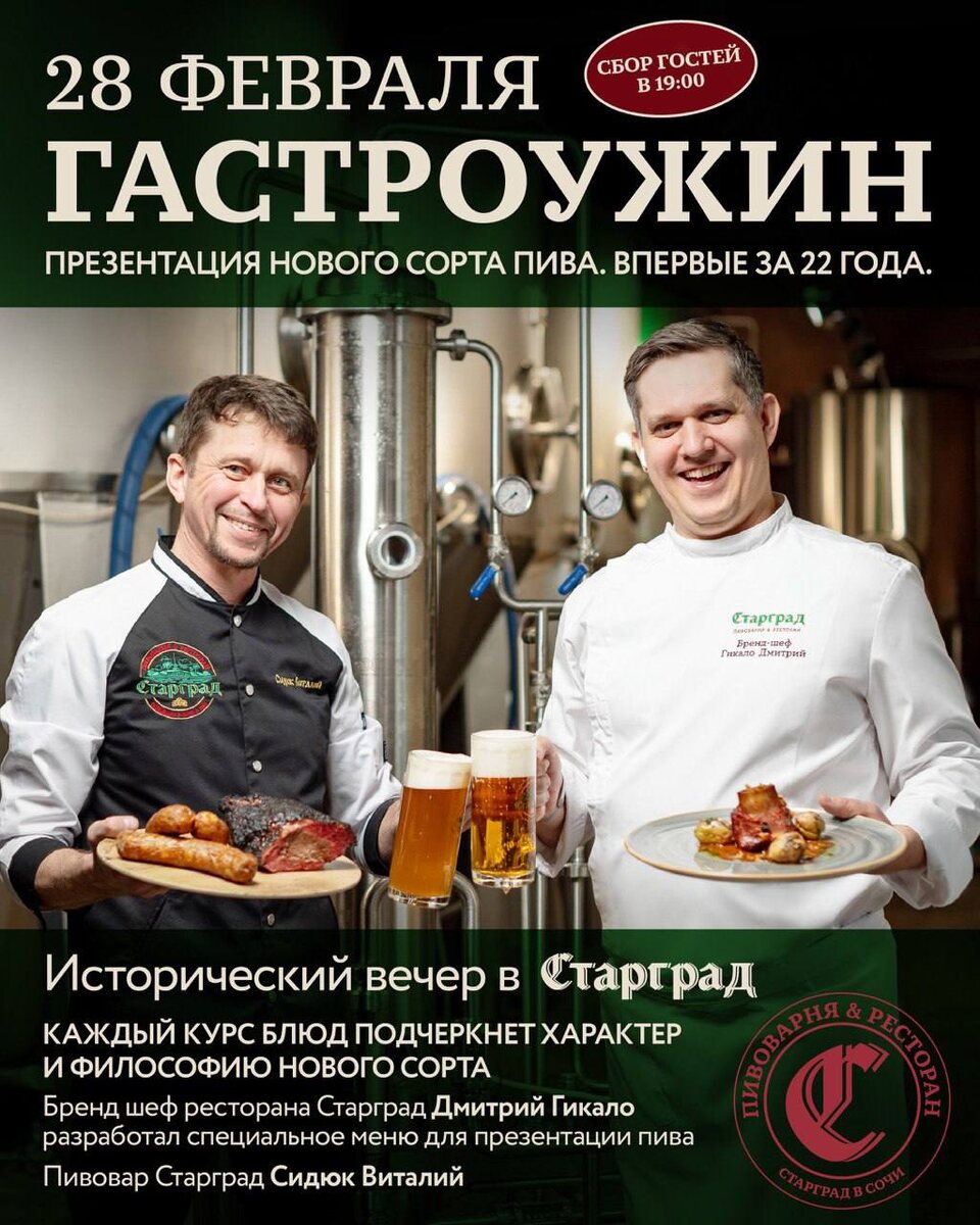 » Впервые за 22 года — Старград приглашает на гастроужин, приуроченный к презентации нового сорта пива. Каждый курс ужина подчеркнёт характер и философию нового сорта. Среди гостей вечера будут разыграны: ✔️Отдых на сутки в Eco Village Sochi на вилле вместимостью до 6 человек. ✔️Отдых 2 часа в Бане у моря! ✔️Алкогольные подарки от партнера Simple 28 февраля / 19:00 Стоимость: 3500₽ В стоимость билета входит -Пикантные дрвесеные грибы в азиатских специях -Фаршированные крылья с киноа и овощами в соусе чили-манго -Теплая закуска из томленного брискета с копченой колабской и компотским перцем -Томленное говяжье ребро в перечном демиглясе с печеным картофелем -Десерт из кваса с шоколадным бисквитом и мороженным К каждому блюду 5 разных сортов пива🍺 Количество мест ограничено. Бронь обязательна: ☎️+7(966)777-88-70 📍Сочи, ул. Приморская, 19