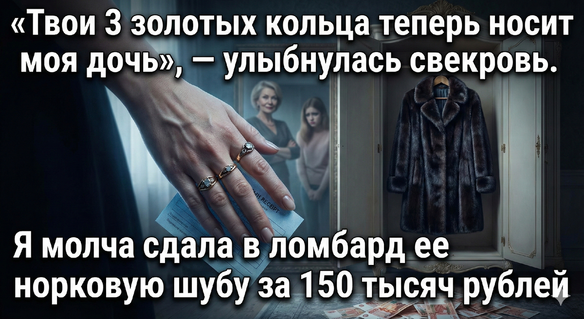 — Для меня эти кольца дороже всех твоих мехов, Рита, — Инна повернулась к свекрови. — Вы сказали, что память должна служить живым. Вот она и послужила. Я взяла деньги. Пятьдесят тысяч я отложила себе — как компенсацию за золото. Остальные...