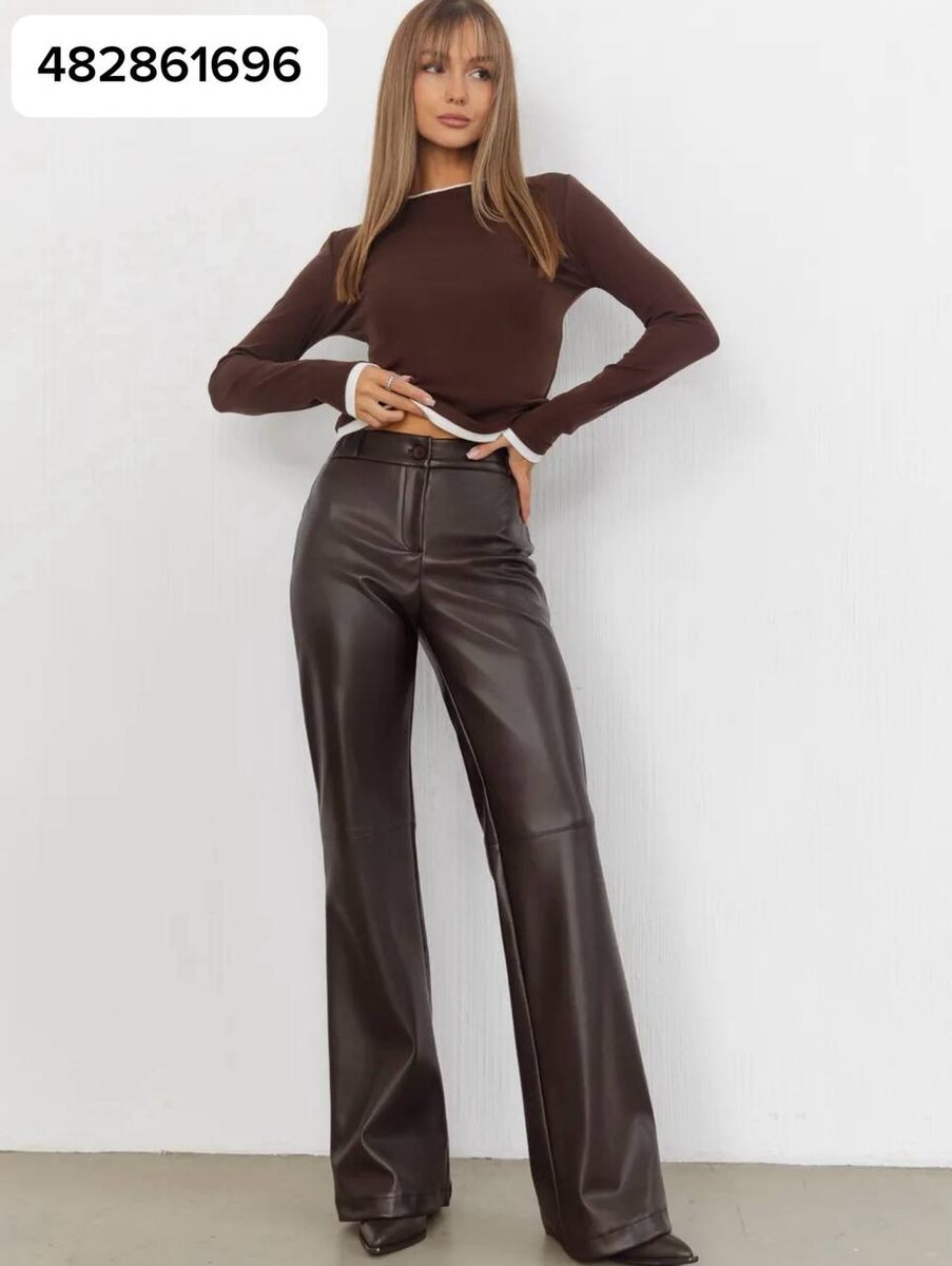 Классические брюки из экокожи с высокой посадкой и клёшем от колена — одна из самых выигрышных моделей для визуальной коррекции фигуры. Шоколадный оттенок даёт мягкую глубину (смотрится благороднее, чем чёрный), а гладкая фактура «собирает» силуэт и добавляет эффект ухоженности.