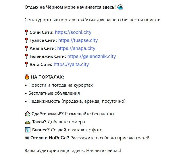 ! 🌊 Сеть курортных порталов «Сити» для вашего бизнеса и поиска: 📍 Сочи Сити: https://sochi.city 📍 Туапсе Сити: https://tuapse.city 📍 Анапа Сити: https://anapa.city 📍 Геленджик Сити: https://gelendzhik.city 📍 Ялта Сити: https://yalta.city 🔥 НА ПОРТАЛАХ: • Новости и погода на курортах • Бесплатные объявления • Недвижимость (продажа, аренда, посуточно) 🏠 Сдаёте жильё? Размещайте бесплатно 🚕 Такси? Добавьте номера 🏢 Бизнес? Создайте каталог с фото 🍽 Отели и HoReCa? Расскажите о себе до приезда гостей Ваша аудитория ищет здесь. Начните сейчас! 📞 ВОПРОСЫ: WhatsApp: +7-918-608-69-29 Telegram: @Andrey220280 E-mail: zhigaylov.ru@yandex.ru #Сочи #Туапсе #Анапа #Геленджик #Ялта #ЧерноеМоре Разослано по группам телеграмм и Дзен с помощью бота: https://t.me/sochitelegram_bot на сайте www.иивк.рф