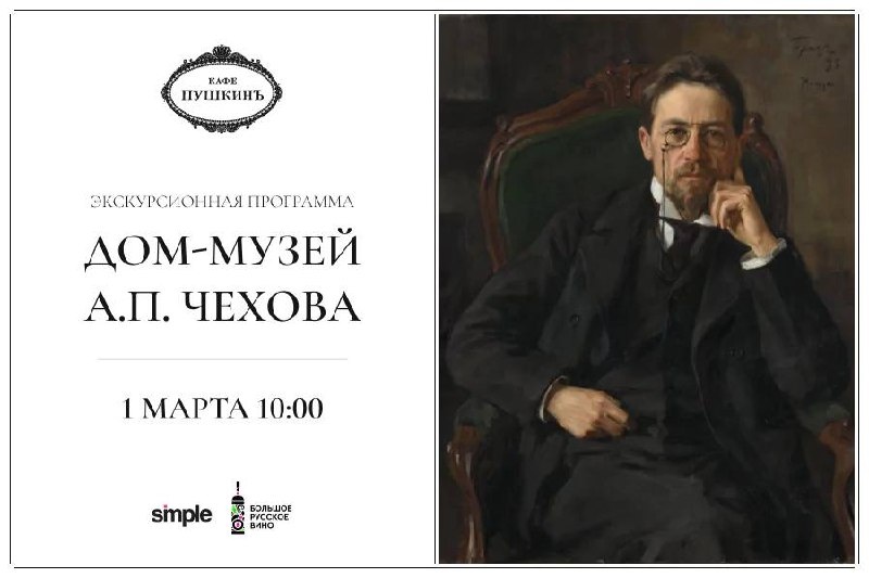 1890 году жил Антон Павлович Чехов! «Живу в Кудрине, против 4-й гимназии, в доме Корнеева, похожем на комод. Цвет дома либеральный, т.е. красный.» В программе: — Завтрак в зале «Библиотека» с двумя горячими блюдами на выбор; — Трансфер; — Экскурсия по дому-музею Антона Павловича Чехова. 🎫 Билеты и подробная информация.