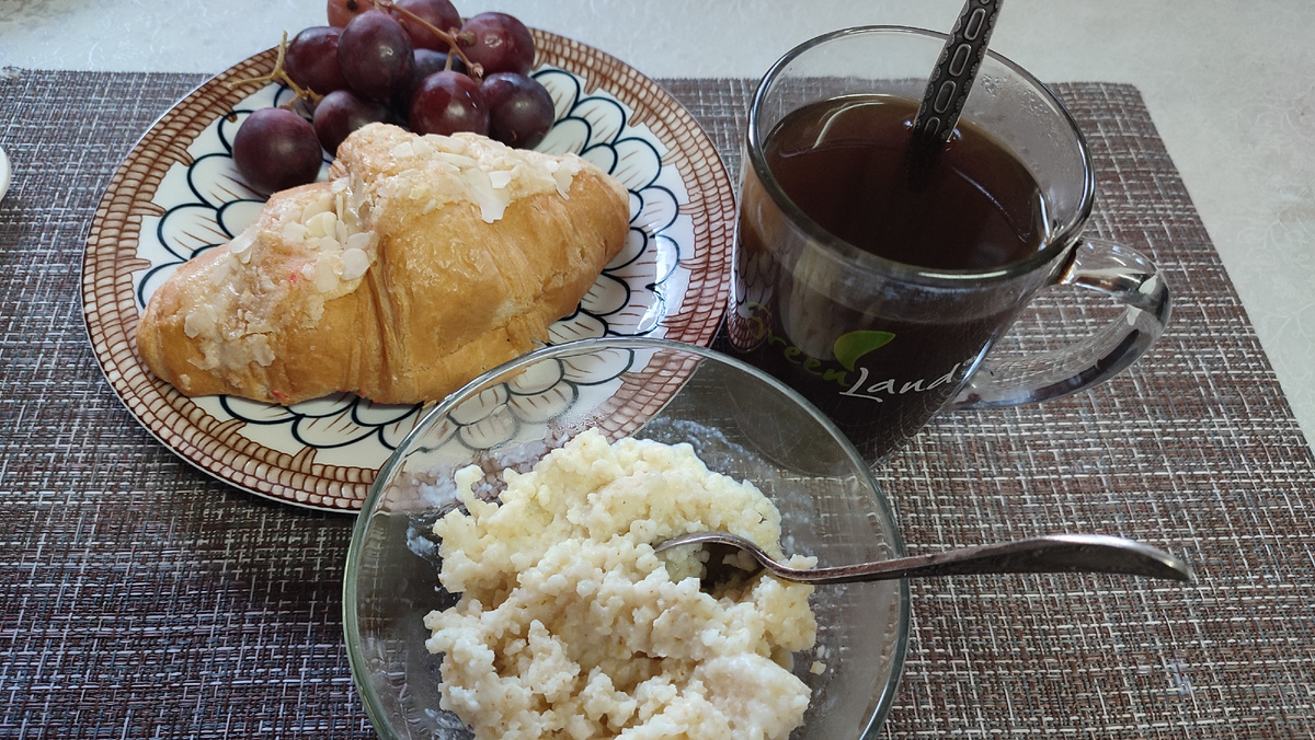 Сегодня каша пшённая, круассан с начинкой и кофе. Виноград — для красоты фото, я его съела на ужин.