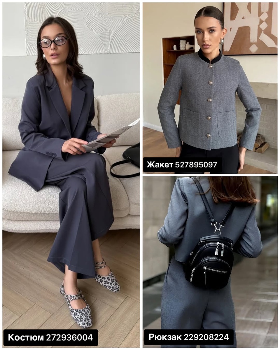 - Пиджак 697905997 + чёрные брюки + строгая сумка — эффектно и уверенно.