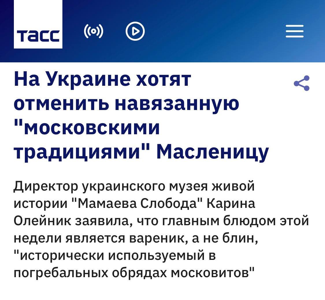 Украинцам нужно есть вареники на Мясницу, а москали едят блины на Масленицу. Примерно так объяснила Олейник.