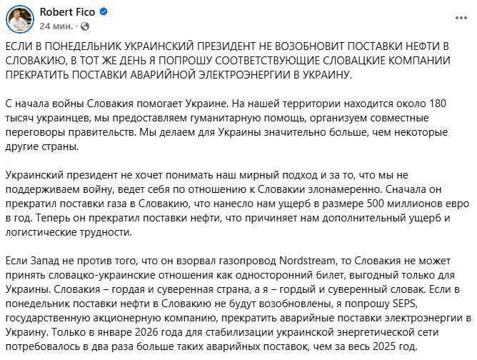❗️Через 2 дня Словакия остановит поставки электроэнергии в Украину, если не возобновятся поставки нефти по нефтепроводу «Дружба», — Фицо