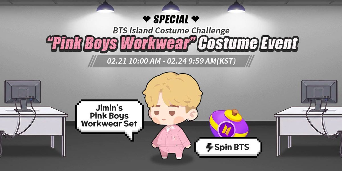 : 💜 Специальное событие BTS Island. Просто 🌀 покрутил волчок 🌀 и получил розовый рабочий комбинезон, который идеально подходит Чимину! 🐥 Приходите поиграть в In the Seom 〰️💗 🏝 Подробнее #InTheSeom @kumihobts