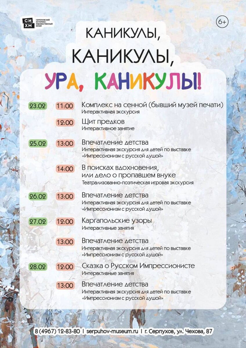 ✨ Каникулы в Серпуховском музее 👉Интерактивные программы, мастер-классы и экскурсии, где можно не только слушать, но и участвовать, играть и создавать. ✨ В программе — два новых события: • детская интерактивная экскурсия «Впечатления детства» по выставке «Импрессионизм с русской душой» • игровое приключение «В поисках вдохновения, или дело о пропавшем внуке» в особняке А.В.Мараевой. 🏢 Серпуховский историко-художественный музей 📍 Московская обл., г. Серпухов, ул. Чехова, д. 87 🎫 Купить билет: https://serpuhov-museum.ru/sobitiya/ura-kanikuly/ ⭐Поддержать канал голосом 💰 Канал Вакансии Серпухова ✅ Мероприятия Серпухов https://dzen.ru/id/66f01c6eb4c6fe60c9ca1608 http://vk.com/serpukhov_events http://dzen.ru/serpukhov_events