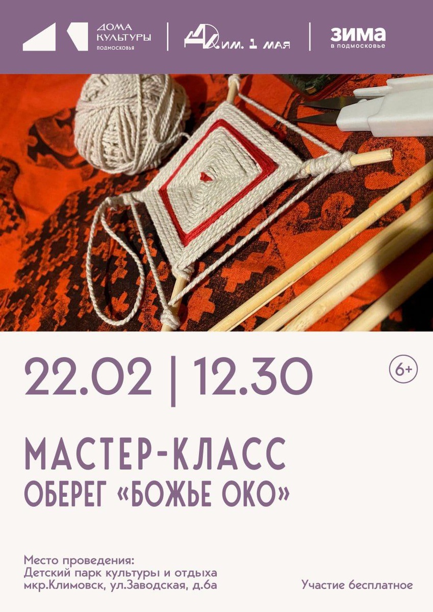 ✨ Мастер-класс "Оберег" Приглашаем на мастер-класс по созданию оберега "Божье Око" 🚫 Возраст: 6+ 📆 22.02.2026 🕒 12:30 🏢 ДК им. 1 мая 📍 г.о. Подольск, мкр-н Климовск, ул. Заводская, 3 💰 Вход свободный❗️ ⭐Поддержать канал голосом 🍰Где поесть в Подольске ✅ Мероприятия Подольск https://dzen.ru/id/66ed500f7b5671493eca3fd6 http://vk.com/podolsk_events http://dzen.ru/podolsk_events