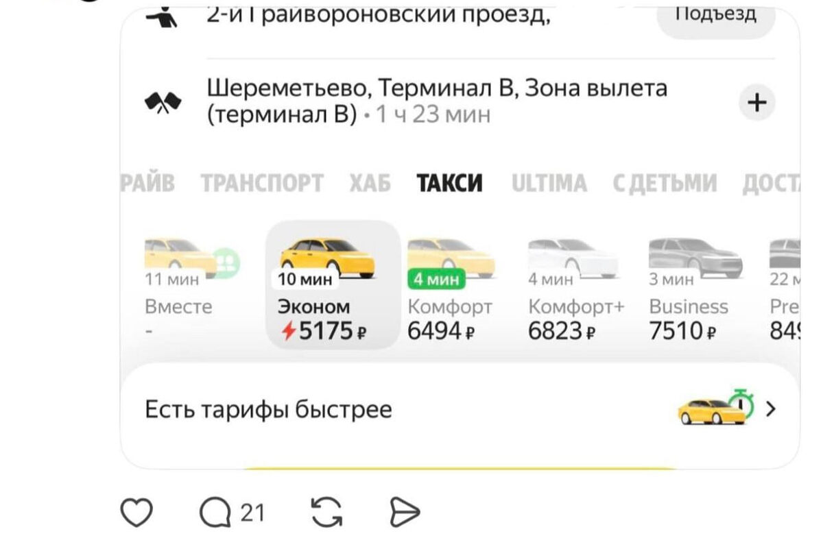 Пять тысяч за такси до Шереметьево в метель: москвичка возмутилась огромной ценой поездки. Девушка опубликовала скриншот из одного из сервисов: ей нужно было проехать до аэропорта около 50 км. Обычно поездка по такому маршруту стоит примерно 1,5-2 тыс. рублей. Во время мощного снегопада в Москве стоимость на тариф «Эконом» подскочила до 5175 рублей, а на «Комфорт» — почти до 6500. Как считаете, нормальная цена? 🤷♂️ — вполне себе 🤬 — нет, совсем обнаглели ⭕️ Подписаться | Мы в MAX | Буст