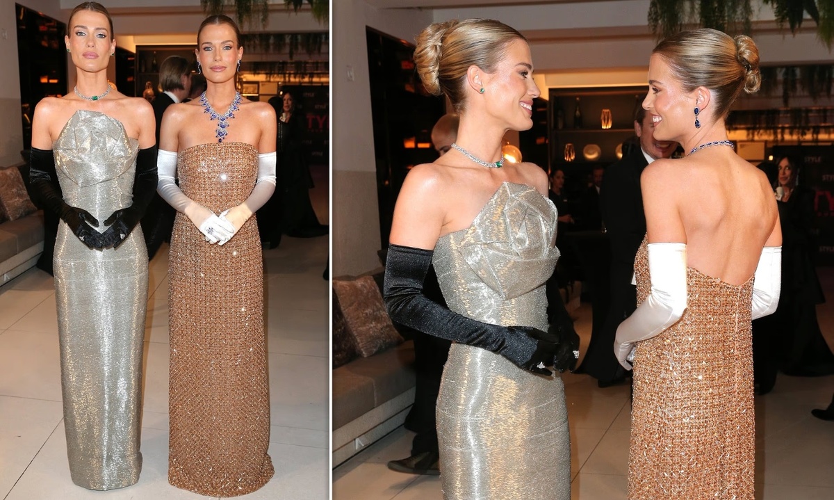 Леди Элиза, воплощение изысканности, выбрала золотое платье, дополнив его элегантными белыми перчатками и нюдовой помадой с лёгким блеском.