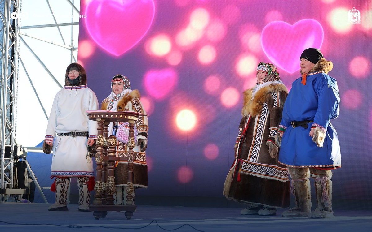 Для двух пар ямальцев марш Мендельсона звучал сегодня прямо на главной сцене Дня оленевода в Тарко-Сале