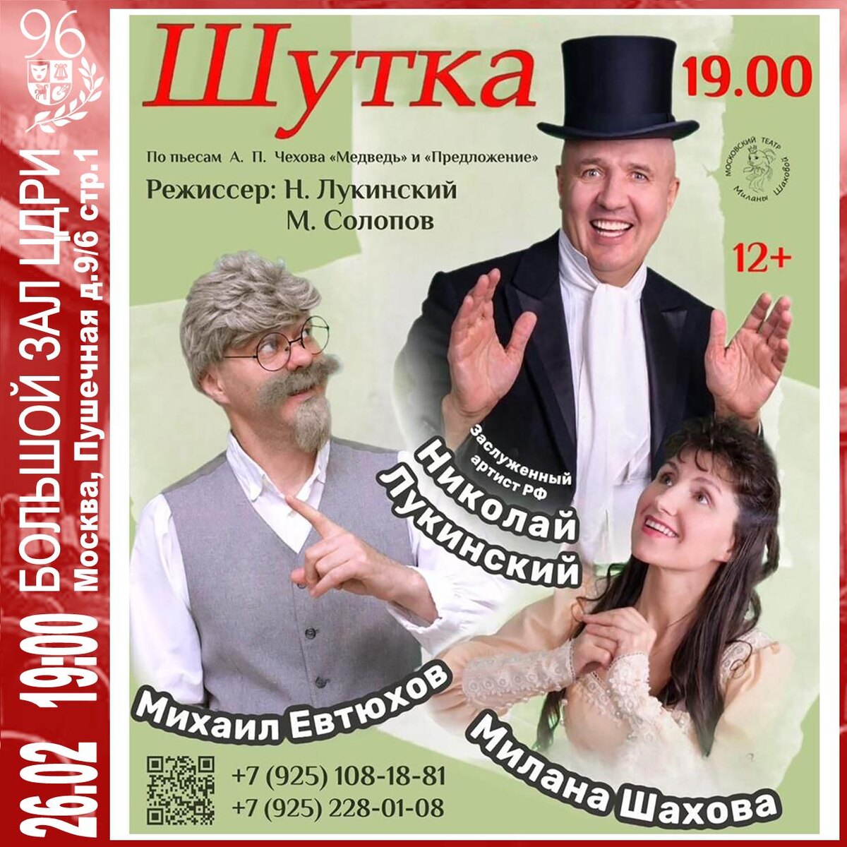 Московский театр Миланы Шаховой Спектакль «Шутка» о том, как смешно и нелепо мы прячемся за условностями, мелочимся, не видя главного. Не понимаем, что самое ценное — это человеческие отношения. И как бы мы не были обижены кем-то, и сколько бы разочарований не было в нашей жизни — а, всё равно, в глубине души мы продолжаем верить в то, что есть любовь и что мы достойны её. Нужно только открыться и впустить её в своё сердце. И жизнь наполнится смыслом и радостью, потому что ничего нет выше и прекраснее этого чувства. Заслуженный артист РФ — Николай Лукинский Михаил Евтюхов Милана Шахова